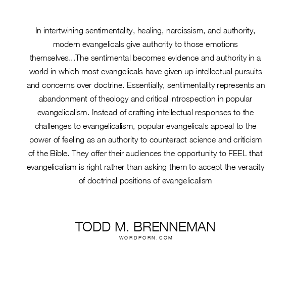 In intertwining sentimentality, healing, narcissism, and authority, modern evangelicals give authority to those emotions themselves...The sentimental becomes evidence and authority in a world in which most evangelicals have given up intellectual pursuits and concerns over doctrine. Essentially, sentimentality represents an abandonment of theology and critical introspection in popular evangelicalism. Instead of crafting intellectual responses to the challenges to evangelicalism, popular evangelicals appeal to the power of feeling as an authority to counteract science and criticism of the Bible. They offer their audiences the opportunity to FEEL that evangelicalism is right rather than asking them to accept the veracity of doctrinal positions of evangelicalism