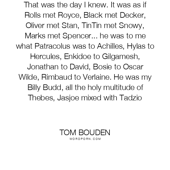 That was the day I knew. It was as if Rolls met Royce, Black met Decker, Oliver met Stan, TinTin met Snowy, Marks met Spencer... he was to me what Patracolus was to Achilles, Hylas to Hercules, Enkidoe to Gilgamesh, Jonathan to David, Bosie to Oscar Wilde, Rimbaud to Verlaine. He was my Billy Budd, all the holy multitude of Thebes, Jasjoe mixed with Tadzio