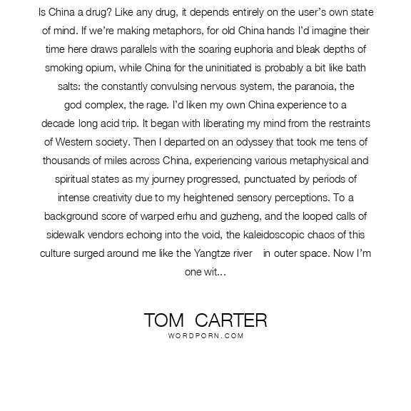 Is China a drug? Like any drug, it depends entirely on the user’s own state of mind. If we’re making metaphors, for old China hands I’d imagine their time here draws parallels with the soaring euphoria and bleak depths of smoking opium, while China for the uninitiated is probably a bit like bath salts: the constantly convulsing nervous system, the paranoia, the god-complex, the rage. I’d liken my own China experience to a decade-long acid trip. It began with liberating my mind from the restraints of Western society. Then I departed on an odyssey that took me tens of thousands of miles across China, experiencing various metaphysical and spiritual states as my journey progressed, punctuated by periods of intense creativity due to my heightened sensory perceptions. To a background score of warped erhu and guzheng, and the looped calls of sidewalk vendors echoing into the void, the kaleidoscopic chaos of this culture surged around me like the Yangtze river – in outer space. Now I’m one with China’s cosmic consciousness. I want to reeducate the communists with love. Or maybe I’m not even here. Maybe I really did perish during my kora around Mount Kailash and none of this ever happened