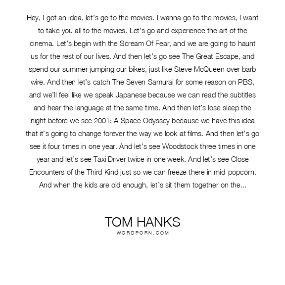 Hey, I got an idea, let’s go to the movies. I wanna go to the movies, I want to take you all to the movies. Let’s go and experience the art of the cinema. Let’s begin with the Scream Of Fear, and we are going to haunt us for the rest of our lives. And then let’s go see The Great Escape, and spend our summer jumping our bikes, just like Steve McQueen over barb wire. And then let’s catch The Seven Samurai for some reason on PBS, and we’ll feel like we speak Japanese because we can read the subtitles and hear the language at the same time. And then let’s lose sleep the night before we see 2001: A Space Odyssey because we have this idea that it’s going to change forever the way we look at films. And then let’s go see it four times in one year. And let’s see Woodstock three times in one year and let’s see Taxi Driver twice in one week. And let’s see Close Encounters of the Third Kind just so we can freeze there in mid-popcorn. And when the kids are old enough, let’s sit them together on the sofa and screen City Lights and Stage Coach and The Best Years of Our Lives and On The Waterfront and Midnight Cowboy and Five Easy Pieces and The Last Picture Show and Raging Bull and Schindler’s List… so that they can understand how the human condition can be captured by this amalgam of light and sound and literature we call the cinema
