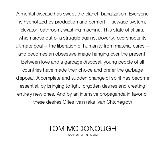 A mental disease has swept the planet: banalization. Everyone is hypnotized by production and comfort -- sewage system, elevator, bathroom, washing machine. This state of affairs, which arose out of a struggle against poverty, overshoots its ultimate goal -- the liberation of humanity from material cares -- and becomes an obsessive image hanging over the present. Between love and a garbage disposal, young people of all countries have made their choice and prefer the garbage disposal. A complete and sudden change of spirit has become essential, by bringing to light forgotten desires and creating entirely new ones. And by an intensive propaganda in favor of these desires.Gilles Ivain (aka Ivan Chtcheglov)