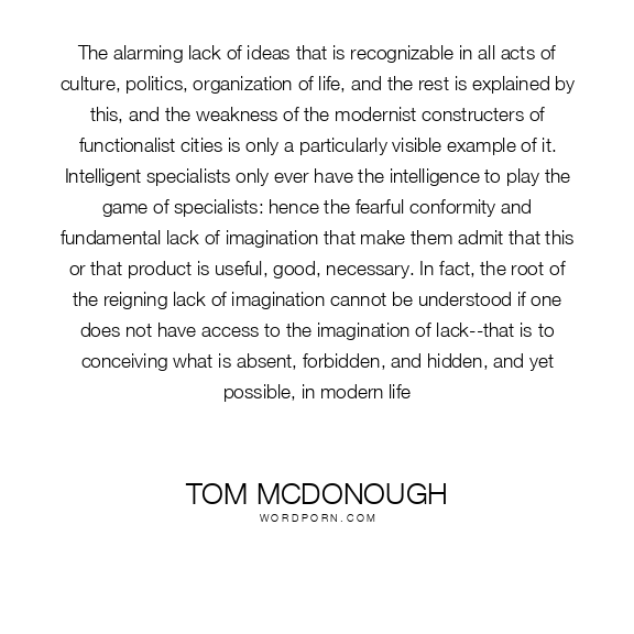 The alarming lack of ideas that is recognizable in all acts of culture, politics, organization of life, and the rest is explained by this, and the weakness of the modernist constructers of functionalist cities is only a particularly visible example of it. Intelligent specialists only ever have the intelligence to play the game of specialists: hence the fearful conformity and fundamental lack of imagination that make them admit that this or that product is useful, good, necessary. In fact, the root of the reigning lack of imagination cannot be understood if one does not have access to the imagination of lack--that is to conceiving what is absent, forbidden, and hidden, and yet possible, in modern life