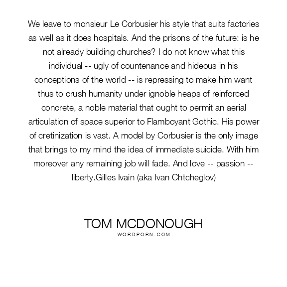 We leave to monsieur Le Corbusier his style that suits factories as well as it does hospitals. And the prisons of the future: is he not already building churches? I do not know what this individual -- ugly of countenance and hideous in his conceptions of the world -- is repressing to make him want thus to crush humanity under ignoble heaps of reinforced concrete, a noble material that ought to permit an aerial articulation of space superior to Flamboyant Gothic. His power of cretinization is vast. A model by Corbusier is the only image that brings to my mind the idea of immediate suicide. With him moreover any remaining job will fade. And love -- passion -- liberty.Gilles Ivain (aka Ivan Chtcheglov)
