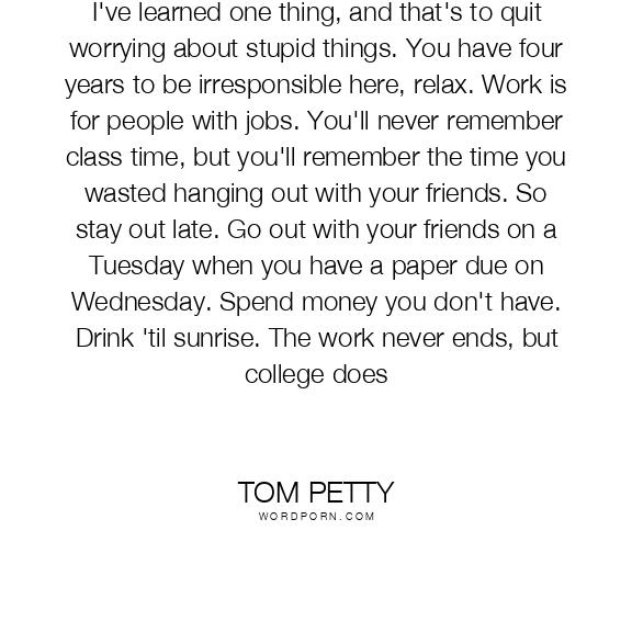 I've learned one thing, and that's to quit worrying about stupid things. You have four years to be irresponsible here, relax. Work is for people with jobs. You'll never remember class time, but you'll remember the time you wasted hanging out with your friends. So stay out late. Go out with your friends on a Tuesday when you have a paper due on Wednesday. Spend money you don't have. Drink 'til sunrise. The work never ends, but college does