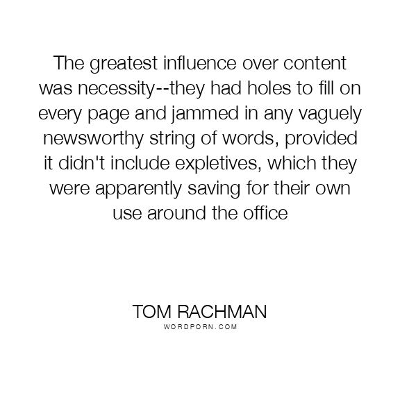 The greatest influence over content was necessity--they had holes to fill on every page and jammed in any vaguely newsworthy string of words, provided it didn't include expletives, which they were apparently saving for their own use around the office