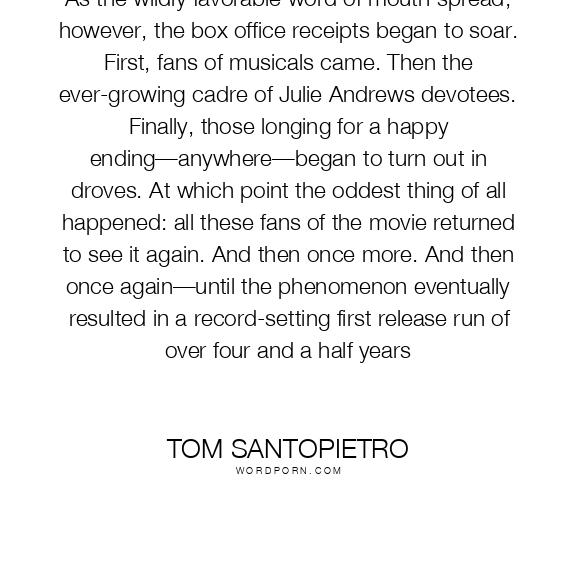 As the wildly favorable word of mouth spread, however, the box office receipts began to soar. First, fans of musicals came. Then the ever-growing cadre of Julie Andrews devotees. Finally, those longing for a happy ending—anywhere—began to turn out in droves. At which point the oddest thing of all happened: all these fans of the movie returned to see it again. And then once more. And then once again—until the phenomenon eventually resulted in a record-setting first release run of over four and a half years