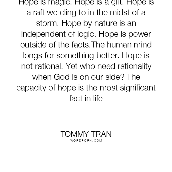 Hope is magic. Hope is a gift. Hope is a raft we cling to in the midst of a storm. Hope by nature is an independent of logic. Hope is power outside of the facts.The human mind longs for something better. Hope is not rational. Yet who need rationality when God is on our side? The capacity of hope is the most significant fact in life