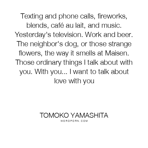 Texting and phone calls, fireworks, blends, café au lait, and music. Yesterday's television. Work and beer. The neighbor's dog, or those strange flowers, the way it smells at Maisen. Those ordinary things I talk about with you. With you... I want to talk about love with you