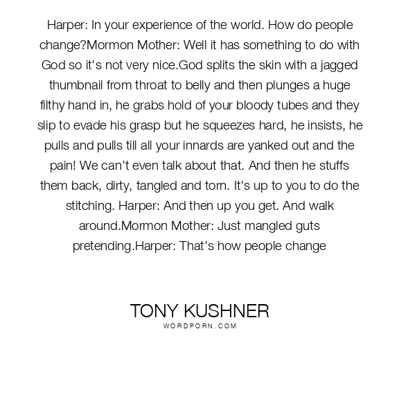 Harper: In your experience of the world. How do people change?Mormon Mother: Well it has something to do with God so it's not very nice.God splits the skin with a jagged thumbnail from throat to belly and then plunges a huge filthy hand in, he grabs hold of your bloody tubes and they slip to evade his grasp but he squeezes hard, he insists, he pulls and pulls till all your innards are yanked out and the pain! We can't even talk about that. And then he stuffs them back, dirty, tangled and torn. It's up to you to do the stitching. Harper: And then up you get. And walk around.Mormon Mother: Just mangled guts pretending.Harper: That's how people change
