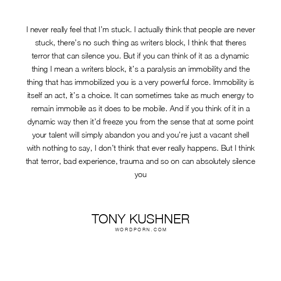 I never really feel that I’m stuck. I actually think that people are never stuck, there’s no such thing as writers block, I think that theres terror that can silence you. But if you can think of it as a dynamic thing I mean a writers block, it’s a paralysis an immobility and the thing that has immobilized you is a very powerful force. Immobility is itself an act, it’s a choice. It can sometimes take as much energy to remain immobile as it does to be mobile. And if you think of it in a dynamic way then it’d freeze you from the sense that at some point your talent will simply abandon you and you’re just a vacant shell with nothing to say, I don’t think that ever really happens. But I think that terror, bad experience, trauma and so on can absolutely silence you