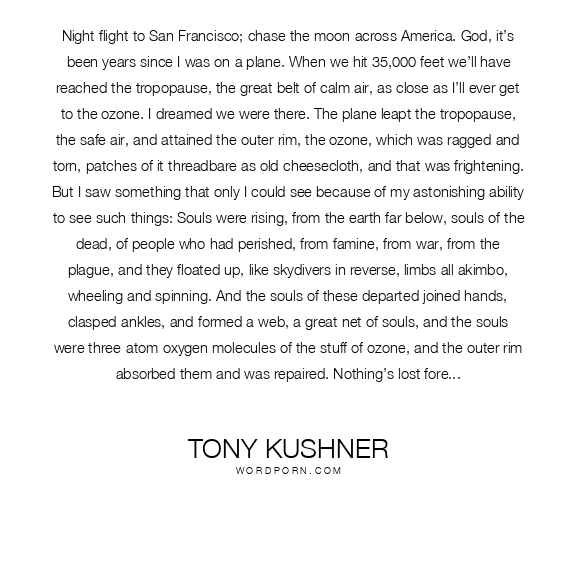 Night flight to San Francisco; chase the moon across America. God, it’s been years since I was on a plane. When we hit 35,000 feet we’ll have reached the tropopause, the great belt of calm air, as close as I’ll ever get to the ozone. I dreamed we were there. The plane leapt the tropopause, the safe air, and attained the outer rim, the ozone, which was ragged and torn, patches of it threadbare as old cheesecloth, and that was frightening. But I saw something that only I could see because of my astonishing ability to see such things: Souls were rising, from the earth far below, souls of the dead, of people who had perished, from famine, from war, from the plague, and they floated up, like skydivers in reverse, limbs all akimbo, wheeling and spinning. And the souls of these departed joined hands, clasped ankles, and formed a web, a great net of souls, and the souls were three-atom oxygen molecules of the stuff of ozone, and the outer rim absorbed them and was repaired. Nothing’s lost forever. In this world, there’s a kind of painful progress. Longing for what we’ve left behind, and dreaming ahead. At least I think that’s so