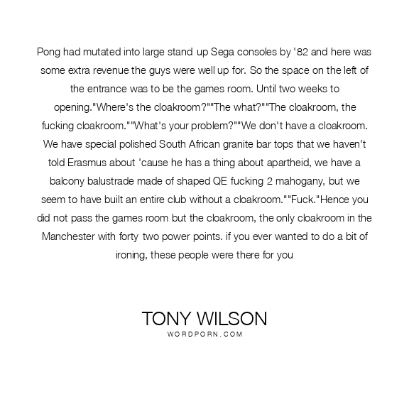 Pong had mutated into large stand-up Sega consoles by '82 and here was some extra revenue the guys were well up for. So the space on the left of the entrance was to be the games room. Until two weeks to opening."Where's the cloakroom?""The what?""The cloakroom, the fucking cloakroom.""What's your problem?""We don't have a cloakroom. We have special polished South African granite bar tops that we haven't told Erasmus about 'cause he has a thing about apartheid, we have a balcony balustrade made of shaped QE-fucking-2 mahogany, but we seem to have built an entire club without a cloakroom.""Fuck."Hence you did not pass the games room but the cloakroom, the only cloakroom in the Manchester with forty-two power points. if you ever wanted to do a bit of ironing, these people were there for you