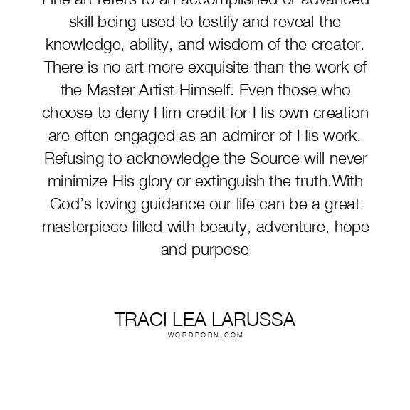 Fine art refers to an accomplished or advanced skill being used to testify and reveal the knowledge, ability, and wisdom of the creator. There is no art more exquisite than the work of the Master Artist Himself. Even those who choose to deny Him credit for His own creation are often engaged as an admirer of His work. Refusing to acknowledge the Source will never minimize His glory or extinguish the truth.With God’s loving guidance our life can be a great masterpiece filled with beauty, adventure, hope and purpose