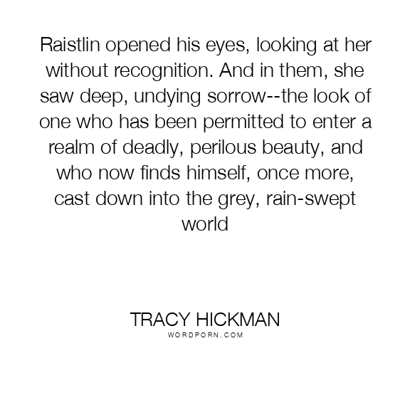 Raistlin opened his eyes, looking at her without recognition. And in them, she saw deep, undying sorrow--the look of one who has been permitted to enter a realm of deadly, perilous beauty, and who now finds himself, once more, cast down into the grey, rain-swept world