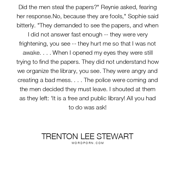 Did the men steal the papers?" Reynie asked, fearing her response.No, because they are fools," Sophie said bitterly. "They demanded to see the papers, and when I did not answer fast enough -- they were very frightening, you see -- they hurt me so that I was not awake. . . . When I opened my eyes they were still trying to find the papers. They did not understand how we organize the library, you see. They were angry and creating a bad mess. . . . The police were coming and the men decided they must leave. I shouted at them as they left: 'It is a free and public library! All you had to do was ask!