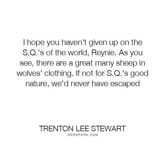 Trenton Lee Stewart quote. I hope you haven't given up on the S.Q.'s of the world, Reynie. As you see, there are a great many sheep in wolves' clothing. If not for S.Q.'s good nature, we'd never have escaped