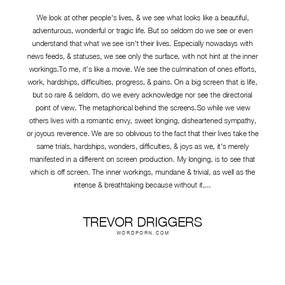 We look at other people's lives, & we see what looks like a beautiful, adventurous, wonderful or tragic life. But so seldom do we see or even understand that what we see isn't their lives. Especially nowadays with news feeds, & statuses, we see only the surface, with not hint at the inner workings.To me, it's like a movie. We see the culmination of ones efforts, work, hardships, difficulties, progress, & pains. On a big screen that is life, but so rare & seldom, do we every acknowledge nor see the directorial point of view. The metaphorical behind the screens.So while we view others lives with a romantic envy, sweet longing, disheartened sympathy, or joyous reverence. We are so oblivious to the fact that their lives take the same trials, hardships, wonders, difficulties, & joys as we, it's merely manifested in a different on screen production. My longing, is to see that which is off screen. The inner workings, mundane & trivial, as well as the intense & breathtaking because without it, the picture it culminated in would not be.If we only take things at face value, we'll miss the wonders of the inner working. That which lies beyond sight, hidden away within. While it is what appears without that we all see, that which lies within makes what we see make sense.And it's in understanding someone's life & situation, that you can come to value their life & them