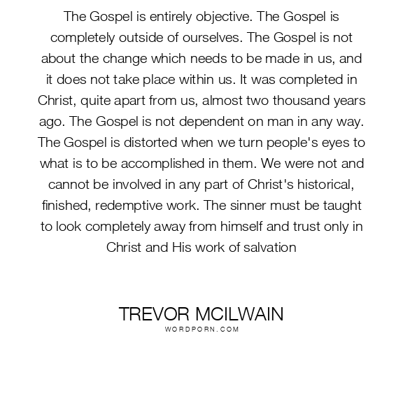 The Gospel is entirely objective. The Gospel is completely outside of ourselves. The Gospel is not about the change which needs to be made in us, and it does not take place within us. It was completed in Christ, quite apart from us, almost two thousand years ago. The Gospel is not dependent on man in any way. The Gospel is distorted when we turn people's eyes to what is to be accomplished in them. We were not and cannot be involved in any part of Christ's historical, finished, redemptive work. The sinner must be taught to look completely away from himself and trust only in Christ and His work of salvation