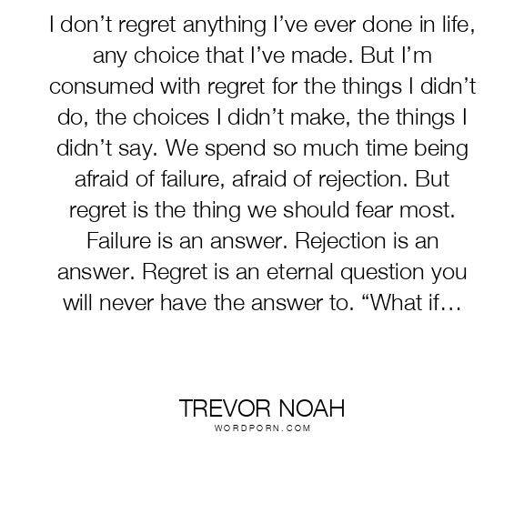 I don’t regret anything I’ve ever done in life, any choice that I’ve made. But I’m consumed with regret for the things I didn’t do, the choices I didn’t make, the things I didn’t say. We spend so much time being afraid of failure, afraid of rejection. But regret is the thing we should fear most. Failure is an answer. Rejection is an answer. Regret is an eternal question you will never have the answer to. “What if…