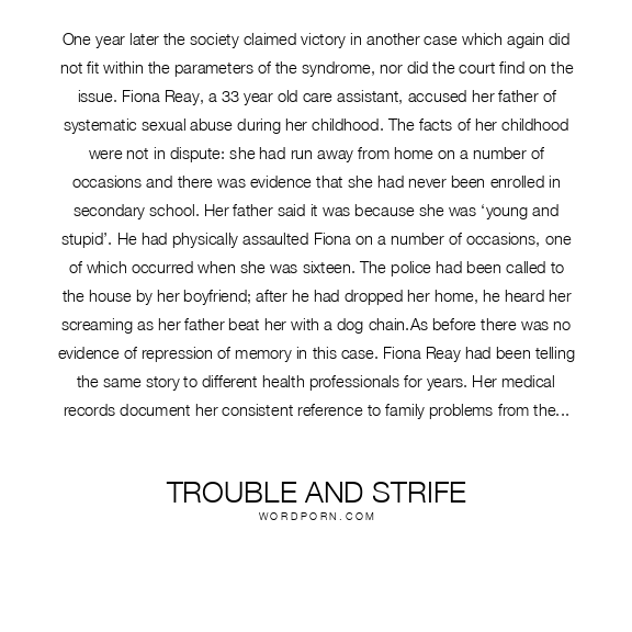 One year later the society claimed victory in another case which again did not fit within the parameters of the syndrome, nor did the court find on the issue. Fiona Reay, a 33 year old care assistant, accused her father of systematic sexual abuse during her childhood. The facts of her childhood were not in dispute: she had run away from home on a number of occasions and there was evidence that she had never been enrolled in secondary school. Her father said it was because she was ‘young and stupid’. He had physically assaulted Fiona on a number of occasions, one of which occurred when she was sixteen. The police had been called to the house by her boyfriend; after he had dropped her home, he heard her screaming as her father beat her with a dog chain.As before there was no evidence of repression of memory in this case. Fiona Reay had been telling the same story to different health professionals for years. Her medical records document her consistent reference to family problems from the age of 14. She finally made a clear statement in 1982 when she asked a gynaecologist if her need for a hysterectomy could be related to the fact that she had been sexually abused by her father. Five years later she was admitted to psychiatric hospital stating that one of the precipitant factors causing her breakdown had been an unexpected visit from her father. She found him stroking her daughter. There had been no therapy, no regression and no hypnosis prior to the allegations being made public.The jury took 27 minutes to find Fiona Reay’s father not guilty of rape and indecent assault. As before, the court did not hear evidence from expert witnesses stating that Fiona was suffering from false memory syndrome. The only suggestion of this was by the defence counsel, Toby Hedworth. In his closing remarks he referred to the ‘worrying phenomenon of people coming to believe in phantom memories’.The next case which was claimed as a triumph for false memory was heard in March 1995. A father was aquitted of raping his daughter. The claims of the BFMS followed the familiar pattern of not fitting within the parameters of false memory at all. The daughter made the allegations to staff members whom she had befriended during her stay in psychiatric hospital. As before there was no evidence of memory repression or recovery during therapy and again the case failed due to lack of corroborating evidence. Yet the society picked up on the defence solicitor’s statements that the daughter was a prone to ‘fantasise’ about sexual matters and had been sexually promiscuous with other patients in the hospital.~ Trouble and Strife, Issues 37-43
