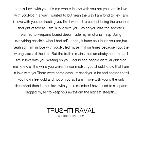 I am in Love with you, it’s me who is in love with you not you,I am in love with you.Not in a way i wanted to but yeah the way I am fond toHey i am in love with you,not treating you like i wanted to but just being the one that thought of toyeah I am in love with you,Loving you was the secrete i wanted to keepand buried deep inside my emotional heap,Doing everything possible what i had toBut baby it hurts as it hurts you too,but yeah still i am in love with you,Pulled myself million times coz i got the wrong vibe all the time,but the truth remains the samebaby hear me as i am in love with you,Waiting on you I could see people were laughing on meI knew all the while you weren't near me.But you should know that I am in love with youThere were some days I missed you a lot and scared to tell you how i feel cold and hotfor you as i am in love with you is the only dreamAnd then I am in love with youi remember i have cried to sleepand bagged myself to keep you awayfrom the highest steepthe voice that said from within me I am in love with youJust I LOVE YOU was the only words I wanna hear from youeven while knowing, you don’t mean tocoz simply I feel the way I wanted toLoving to say i am in love with you.wake up in the morning with only you in my mind till i sleep at deep way in the nightI know its all silly things for your kindbut its perfect to me as clearly - deeply in love with youWhen you being nice to me that scares me sometimesbut bottom in my heart it feels so nice coz during that timei am in love with you,Doesn't matter whatever i do with you even things i have never done beforeand i enjoyed them all coz simply as I am in love with you.In the first waiting on you was the favorite thing in my dayweather it s a call or just a look from you from the farthest bayI asked myself why and the voice within me said that i am in love with you