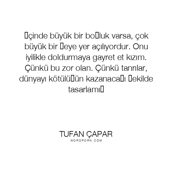 İçinde büyük bir boşluk varsa, çok büyük bir şeye yer açılıyordur. Onu iyilikle doldurmaya gayret et kızım. Çünkü bu zor olan. Çünkü tanrılar, dünyayı kötülüğün kazanacağı şekilde tasarlamış