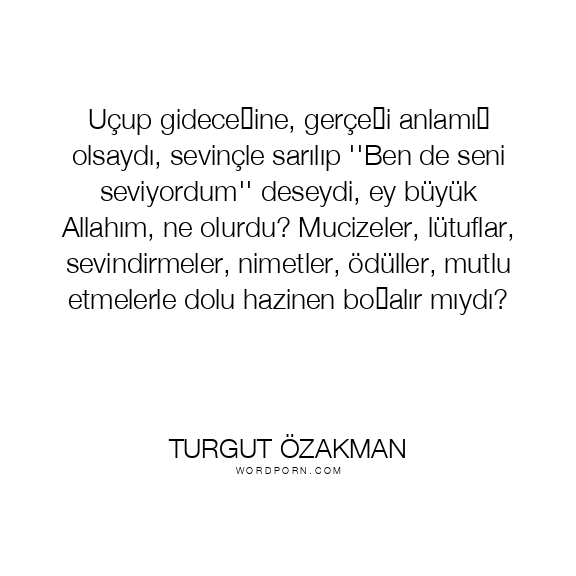 Uçup gideceğine, gerçeği anlamış olsaydı, sevinçle sarılıp ''Ben de seni seviyordum'' deseydi, ey büyük Allahım, ne olurdu? Mucizeler, lütuflar, sevindirmeler, nimetler, ödüller, mutlu etmelerle dolu hazinen boşalır mıydı?