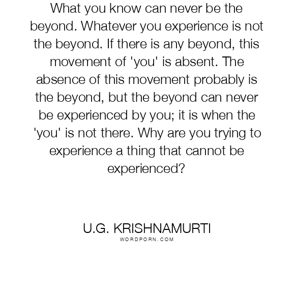 What you know can never be the beyond. Whatever you experience is not the beyond. If there is any beyond, this movement of 'you' is absent. The absence of this movement probably is the beyond, but the beyond can never be experienced by you; it is when the 'you' is not there. Why are you trying to experience a thing that cannot be experienced?
