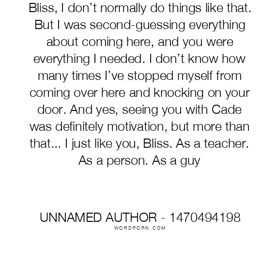 Bliss, I don’t normally do things like that. But I was second-guessing everything about coming here, and you were everything I needed. I don’t know how many times I’ve stopped myself from coming over here and knocking on your door. And yes, seeing you with Cade was definitely motivation, but more than that... I just like you, Bliss. As a teacher. As a person. As a guy