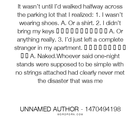 It wasn’t until I’d walked halfway across the parking lot that I realized: 1. I wasn’t wearing shoes. A. Or a shirt. 2. I didn’t bring my keys A. Or anything really. 3. I’d just left a complete stranger in my apartment. A. Naked.Whoever said one-night stands were supposed to be simple with no strings attached had clearly never met the disaster that was me