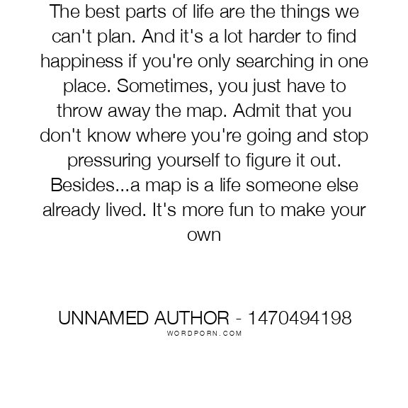 The best parts of life are the things we can't plan. And it's a lot harder to find happiness if you're only searching in one place. Sometimes, you just have to throw away the map. Admit that you don't know where you're going and stop pressuring yourself to figure it out. Besides...a map is a life someone else already lived. It's more fun to make your own