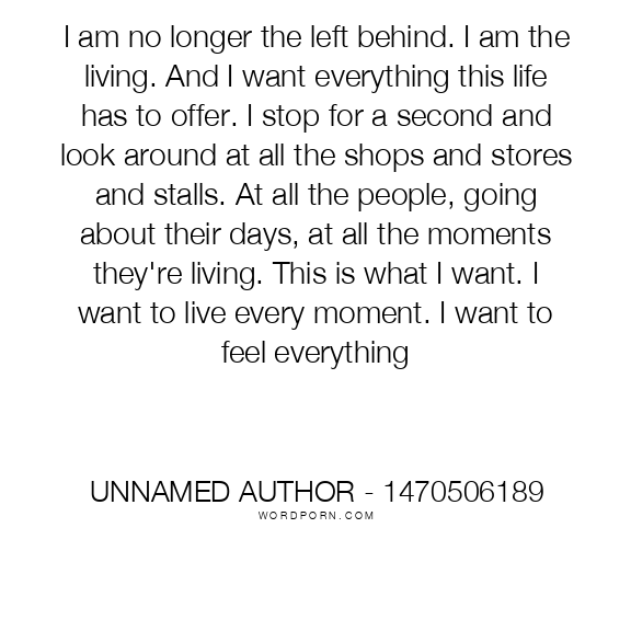 I am no longer the left behind. I am the living. And I want everything this life has to offer. I stop for a second and look around at all the shops and stores and stalls. At all the people, going about their days, at all the moments they're living. This is what I want. I want to live every moment. I want to feel everything