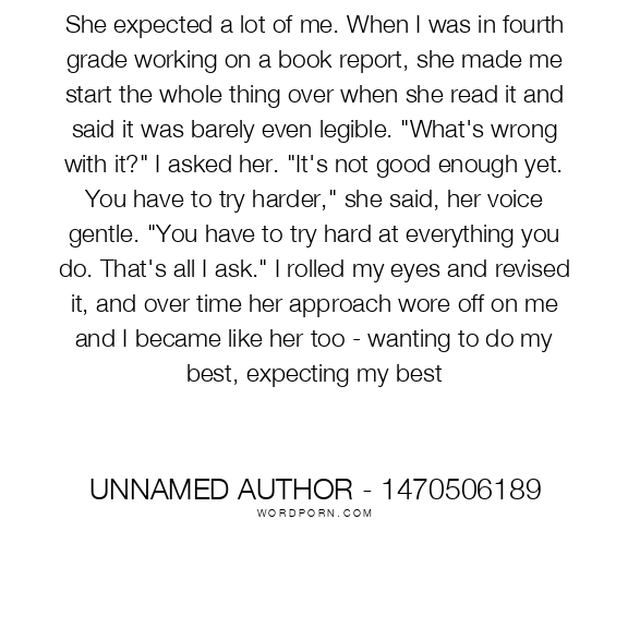 She expected a lot of me. When I was in fourth grade working on a book report, she made me start the whole thing over when she read it and said it was barely even legible. "What's wrong with it?" I asked her. "It's not good enough yet. You have to try harder," she said, her voice gentle. "You have to try hard at everything you do. That's all I ask." I rolled my eyes and revised it, and over time her approach wore off on me and I became like her too - wanting to do my best, expecting my best