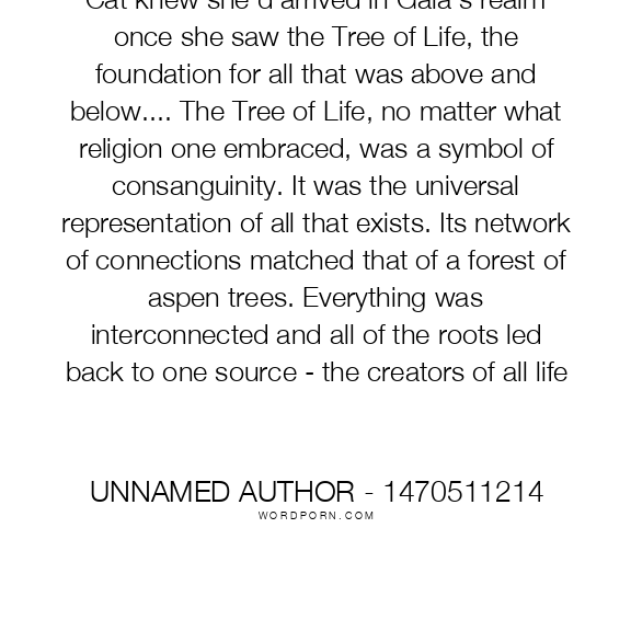 Cat knew she'd arrived in Gaia's realm once she saw the Tree of Life, the foundation for all that was above and below.... The Tree of Life, no matter what religion one embraced, was a symbol of consanguinity. It was the universal representation of all that exists. Its network of connections matched that of a forest of aspen trees. Everything was interconnected and all of the roots led back to one source - the creators of all life