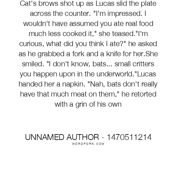Cat's brows shot up as Lucas slid the plate across the counter. "I'm impressed. I wouldn't have assumed you ate real food much less cooked it," she teased."I'm curious, what did you think I ate?" he asked as he grabbed a fork and a knife for her.She smiled. "I don't know, bats... small critters you happen upon in the underworld."Lucas handed her a napkin. "Nah, bats don't really have that much meat on them," he retorted with a grin of his own