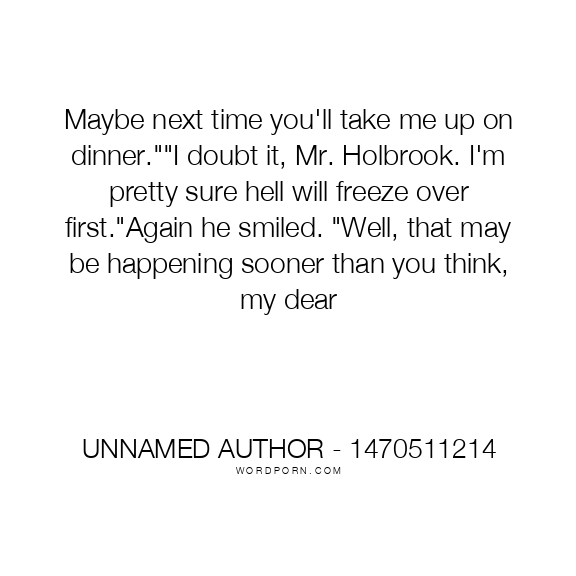 Maybe next time you'll take me up on dinner.""I doubt it, Mr. Holbrook. I'm pretty sure hell will freeze over first."Again he smiled. "Well, that may be happening sooner than you think, my dear