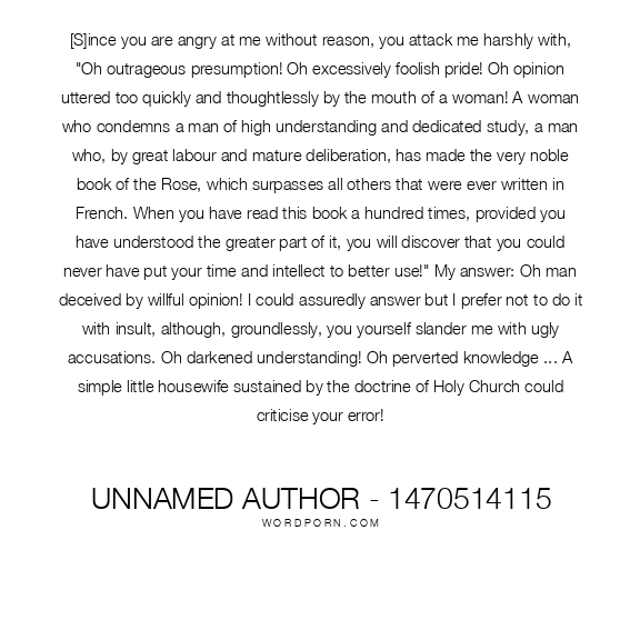 [S]ince you are angry at me without reason, you attack me harshly with, "Oh outrageous presumption! Oh excessively foolish pride! Oh opinion uttered too quickly and thoughtlessly by the mouth of a woman! A woman who condemns a man of high understanding and dedicated study, a man who, by great labour and mature deliberation, has made the very noble book of the Rose, which surpasses all others that were ever written in French. When you have read this book a hundred times, provided you have understood the greater part of it, you will discover that you could never have put your time and intellect to better use!" My answer: Oh man deceived by willful opinion! I could assuredly answer but I prefer not to do it with insult, although, groundlessly, you yourself slander me with ugly accusations. Oh darkened understanding! Oh perverted knowledge ... A simple little housewife sustained by the doctrine of Holy Church could criticise your error!