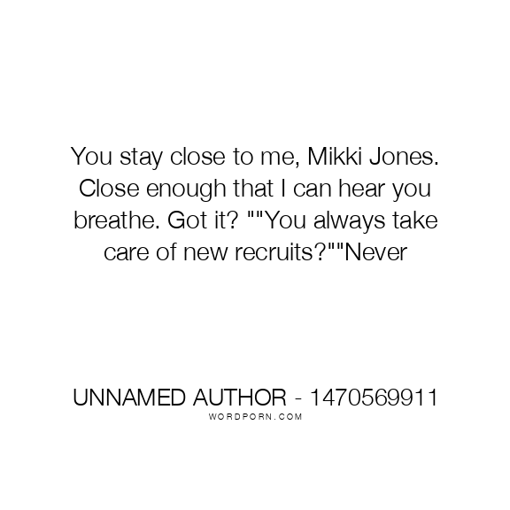 Copy Image You stay close to me, Mikki Jones. Close enough that I can hear you breathe. Got it? ""You always take care of new recruits?""Never Moms Typewriter A A SAVE THIS IMAGE