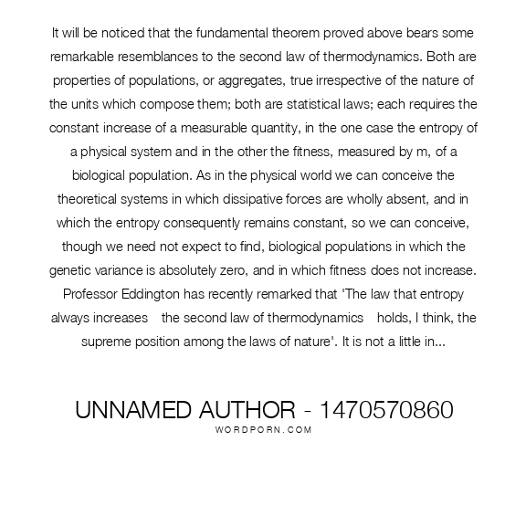 It will be noticed that the fundamental theorem proved above bears some remarkable resemblances to the second law of thermodynamics. Both are properties of populations, or aggregates, true irrespective of the nature of the units which compose them; both are statistical laws; each requires the constant increase of a measurable quantity, in the one case the entropy of a physical system and in the other the fitness, measured by m, of a biological population. As in the physical world we can conceive the theoretical systems in which dissipative forces are wholly absent, and in which the entropy consequently remains constant, so we can conceive, though we need not expect to find, biological populations in which the genetic variance is absolutely zero, and in which fitness does not increase. Professor Eddington has recently remarked that 'The law that entropy always increases—the second law of thermodynamics—holds, I think, the supreme position among the laws of nature'. It is not a little instructive that so similar a law should hold the supreme position among the biological sciences. While it is possible that both may ultimately be absorbed by some more general principle, for the present we should note that the laws as they stand present profound differences—-(1) The systems considered in thermodynamics are permanent; species on the contrary are liable to extinction, although biological improvement must be expected to occur up to the end of their existence. (2) Fitness, although measured by a uniform method, is qualitatively different for every different organism, whereas entropy, like temperature, is taken to have the same meaning for all physical systems. (3) Fitness may be increased or decreased by changes in the environment, without reacting quantitatively upon that environment. (4) Entropy changes are exceptional in the physical world in being irreversible, while irreversible evolutionary changes form no exception among biological phenomena. Finally, (5) entropy changes lead to a progressive disorganization of the physical world, at least from the human standpoint of the utilization of energy, while evolutionary changes are generally recognized as producing progressively higher organization in the organic world