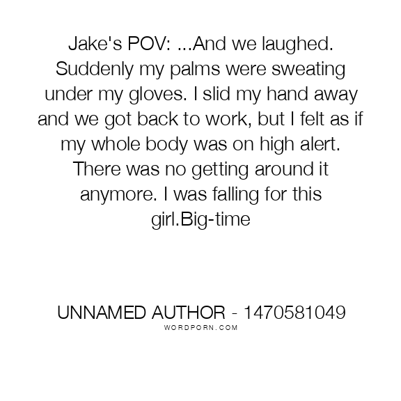Jake's POV: ...And we laughed. Suddenly my palms were sweating under my gloves. I slid my hand away and we got back to work, but I felt as if my whole body was on high alert. There was no getting around it anymore. I was falling for this girl.Big-time