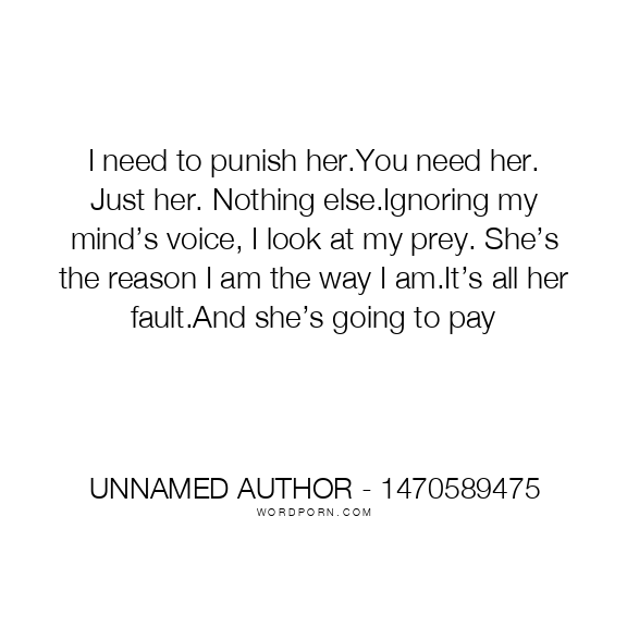 I need to punish her.You need her. Just her. Nothing else.Ignoring my mind’s voice, I look at my prey. She’s the reason I am the way I am.It’s all her fault.And she’s going to pay