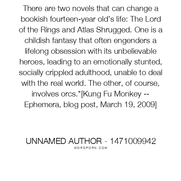 There are two novels that can change a bookish fourteen-year old’s life: The Lord of the Rings and Atlas Shrugged. One is a childish fantasy that often engenders a lifelong obsession with its unbelievable heroes, leading to an emotionally stunted, socially crippled adulthood, unable to deal with the real world. The other, of course, involves orcs."[Kung Fu Monkey -- Ephemera, blog post, March 19, 2009]