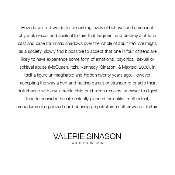 How do we find words for describing levels of betrayal and emotional, physical, sexual and spiritual torture that fragment and destroy a child or cast and case traumatic shadows over the whole of adult life? We might, as a society, slowly find it possible to accept that one in four citizens are likely to have experience some form of emotional, psychical, sexual or spiritual abuse (McQueen, Itzin, Kennedy, Sinason, & Maxted, 2008), in itself a figure unimaginable and hidden twenty years ago. However, accepting the way a hurt and hurting parent or stranger re-enacts their disturbance with a vulnerable child or children remains far easier to digest than to consider the intellectually planned, scientific, methodical, procedures of organized child-abusing perpetrators-in other words, torture