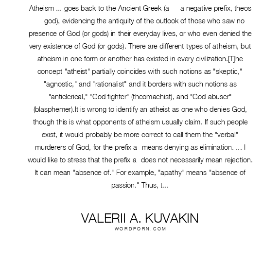 Atheism ... goes back to the Ancient Greek (a — a negative prefix, theos — god), evidencing the antiquity of the outlook of those who saw no presence of God (or gods) in their everyday lives, or who even denied the very existence of God (or gods). There are different types of atheism, but atheism in one form or another has existed in every civilization.[T]he concept "atheist" partially coincides with such notions as "skeptic," "agnostic," and "rationalist" and it borders with such notions as "anticlerical," "God fighter" (theomachist), and "God abuser" (blasphemer).It is wrong to identify an atheist as one who denies God, though this is what opponents of atheism usually claim. If such people exist, it would probably be more correct to call them the "verbal" murderers of God, for the prefix a- means denying as elimination. ... I would like to stress that the prefix a- does not necessarily mean rejection. It can mean "absence of." For example, "apathy" means "absence of passion." Thus, the concept "atheist" does not necessarily mean nihilism