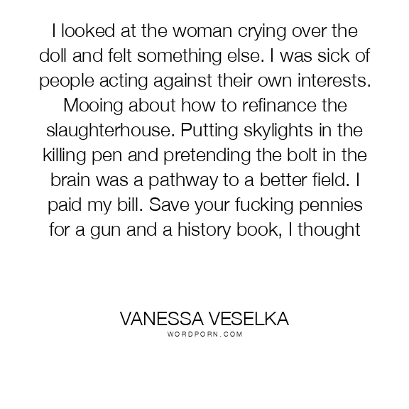 I looked at the woman crying over the doll and felt something else. I was sick of people acting against their own interests. Mooing about how to refinance the slaughterhouse. Putting skylights in the killing pen and pretending the bolt in the brain was a pathway to a better field. I paid my bill. Save your fucking pennies for a gun and a history book, I thought