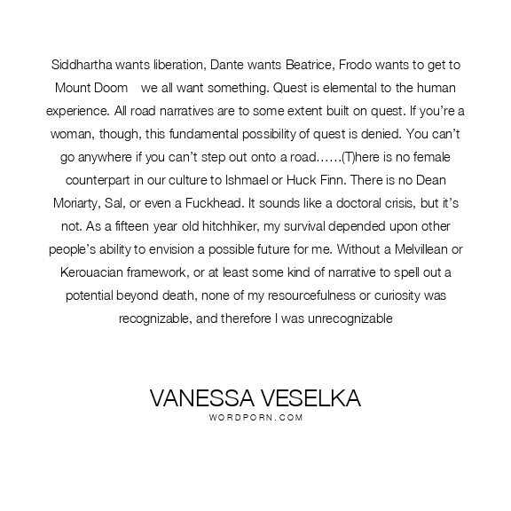 Siddhartha wants liberation, Dante wants Beatrice, Frodo wants to get to Mount Doom—we all want something. Quest is elemental to the human experience. All road narratives are to some extent built on quest. If you’re a woman, though, this fundamental possibility of quest is denied. You can’t go anywhere if you can’t step out onto a road……(T)here is no female counterpart in our culture to Ishmael or Huck Finn. There is no Dean Moriarty, Sal, or even a Fuckhead. It sounds like a doctoral crisis, but it’s not. As a fifteen-year-old hitchhiker, my survival depended upon other people’s ability to envision a possible future for me. Without a Melvillean or Kerouacian framework, or at least some kind of narrative to spell out a potential beyond death, none of my resourcefulness or curiosity was recognizable, and therefore I was unrecognizable