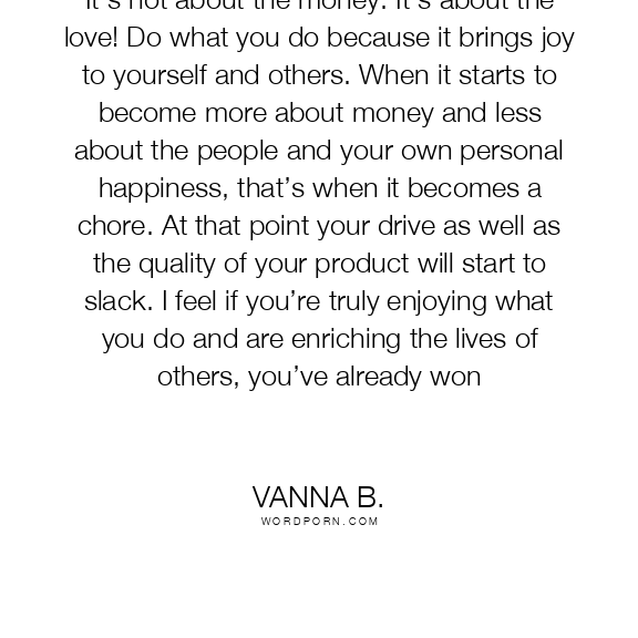 It's not about the money. It's about the love! Do what you do because it brings joy to yourself and others. When it starts to become more about money and less about the people and your own personal happiness, that’s when it becomes a chore. At that point your drive as well as the quality of your product will start to slack. I feel if you’re truly enjoying what you do and are enriching the lives of others, you’ve already won