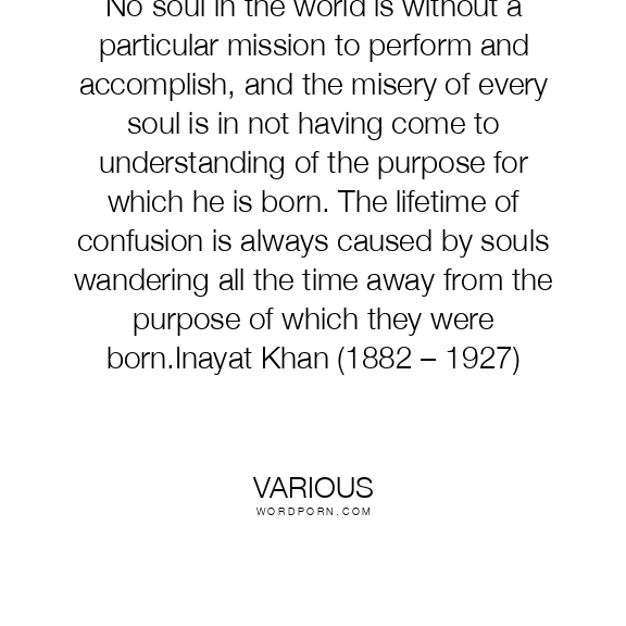 No soul in the world is without a particular mission to perform and accomplish, and the misery of every soul is in not having come to understanding of the purpose for which he is born. The lifetime of confusion is always caused by souls wandering all the time away from the purpose of which they were born.Inayat Khan (1882 – 1927)
