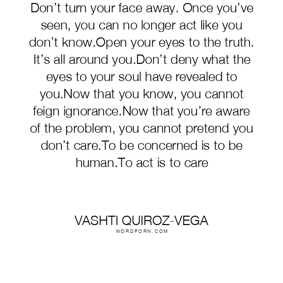 Don’t turn your face away. Once you’ve seen, you can no longer act like you don’t know.Open your eyes to the truth. It’s all around you.Don’t deny what the eyes to your soul have revealed to you.Now that you know, you cannot feign ignorance.Now that you’re aware of the problem, you cannot pretend you don’t care.To be concerned is to be human.To act is to care