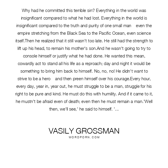 Why had he committed this terrible sin? Everything in the world was insignificant compared to what he had lost. Everything in the world is insignificant compared to the truth and purity of one small man – even the empire stretching from the Black Sea to the Pacific Ocean, even science itself.Then he realized that it still wasn't too late. He still had the strength to lift up his head, to remain his mother's son.And he wasn't going to try to console himself or justify what he had done. He wanted this mean, cowardly act to stand all his life as a reproach; day and night it would be something to bring him back to himself. No, no, no! He didn't want to strive to be a hero – and then preen himself over his courage.Every hour, every day, year in, year out, he must struggle to be a man, struggle for his right to be pure and kind. He must do this with humility. And if it came to it, he mustn't be afraid even of death; even then he must remain a man.'Well then, we'll see,' he said to himself. 'Maybe I do have enough strength. Your strength, Mother